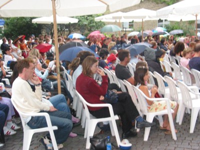 Das Hörspiel "Im Schloss der schlafenden Vampire" schaffte bei Sonnenuntergang mit Gewitterstimmung eine ganz besondere Atmosphäre im bewachsenen Innenhof. Wie auf den Fotos zu sehen, war das Publikum sehr gut vorbereitet und hatte Regenjacken und Schirme dabei. Als das Hörspiel schließlich zu Ende war, war es draußen auch dunkel und mit dem anschließenden Kinofilm "Drachenauge", der auch Open-Air gezeigt wurde, fand ein rundum gelungener Abend einen gebührenden Abschluss. |